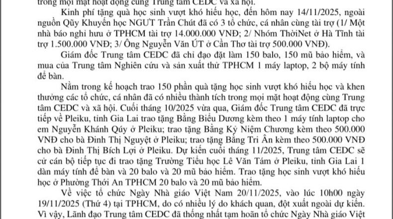 5 Tháng Chín, 2025Thông báo tạm hoãn tổ chức Ngày Nhà giáo Việt Nam 20.11.2025