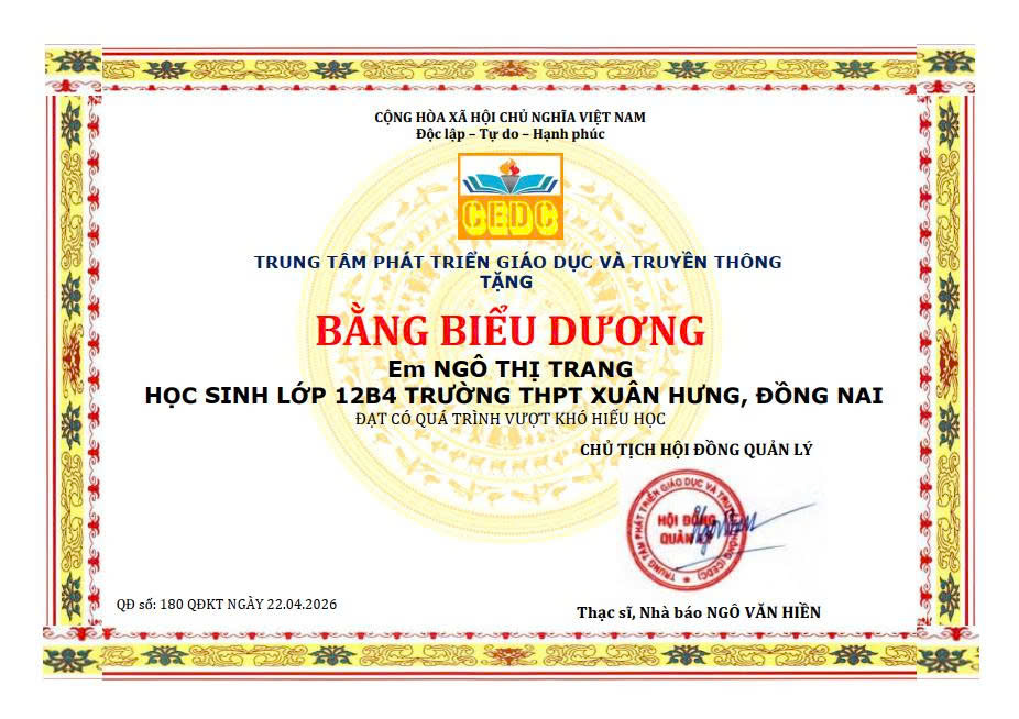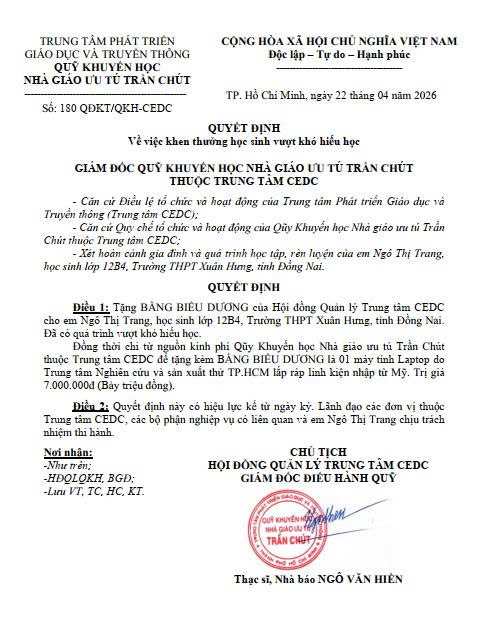 Ngày 22 tháng 04 năm 2026, Chủ tịch Hội đồng quản lý, Giám đốc điều hành Qũy Khuyến học Nhà giáo ưu tú Trần Chút thuộc Trung tâm CEDC đã ký Quyết định số: 180 QĐKT/QKH-CEDC tặng BẰNG BIỂU DƯƠNG của Hội đồng Quản lý Trung tâm CEDC cho em Ngô Thị Trang, học sinh lớp 12B4, Trường THPT Xuân Hưng, tỉnh Đồng Nai. Đã có quá trình vượt khó hiếu học.